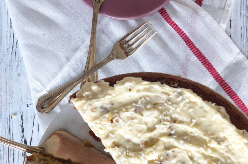 Jeg plejer at pifte denne kage op med mørk chokoladeganache – den lille herhjemme slikker dog ganachen af først inden han tager en bid af kagen – det er så sødt at observere.